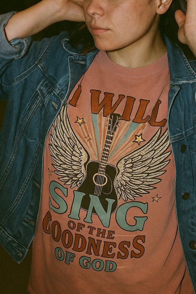 Bold faith meets vintage vibes. This powerful design features a winged guitar bursting with praise, surrounded by radiant stars and a message that declares your devotion loud and clear: “I Will Sing of the Goodness of God.” Perfect for worship leaders, music lovers, and women who walk in daily gratitude.